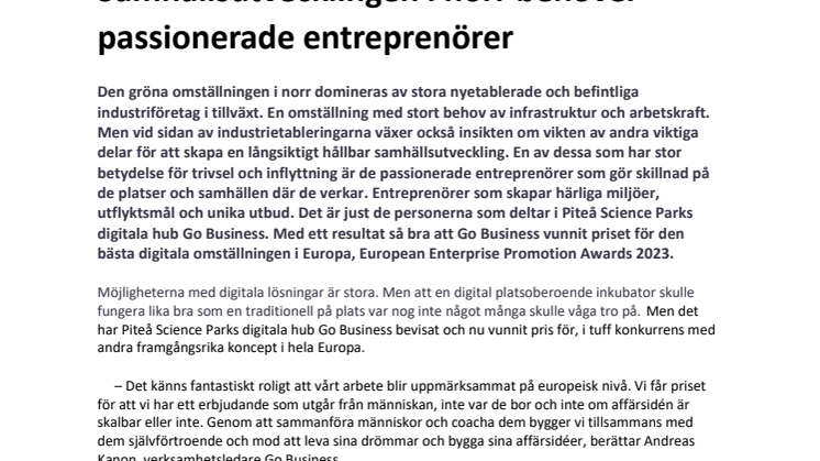 Den gröna omställningen i norr domineras av stora nyetablerade och befintliga industriföretag i tillväxt. En omställning med stort behov av infrastruktur och arbetskraft. Men vid sidan av industrietableringarna växer också insikten om vikten av andra viktiga delar för att skapa en långsiktigt hållbar samhällsutveckling. En av dessa som har stor betydelse för trivsel och inflyttning är de passionerade entreprenörer som gör skillnad på de platser och samhällen där de verkar. Entreprenörer som skapar härliga miljöer, utflyktsmål och unika utbud. Det är just de personerna som deltar i Piteå Science Parks digitala hub Go Business. Med ett resultat så bra att Go Business vunnit priset för den bästa digitala omställningen i Europa, European Enterprise Promotion Awards 2023.