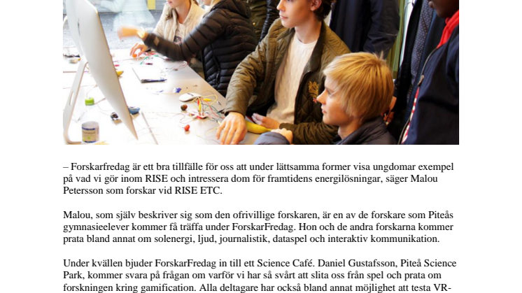 Malou, som själv beskriver sig som den ofrivillige forskaren, är en av de forskare som Piteås gymnasieelever kommer få träffa under ForskarFredag. Hon och de andra forskarna kommer prata bland annat om solenergi, ljud, journalistik, dataspel och interaktiv kommunikation.