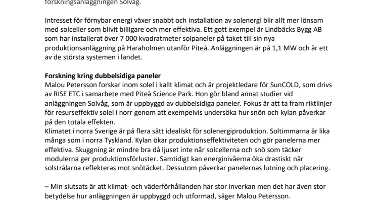 Malou Petersson forskar inom solel i kallt klimat och är projektledare för SunCOLD, som drivs av RISE ETC i samarbete med Piteå Science Park. Hon gör bland annat studier vid anläggningen Solvåg, som är uppbyggd av dubbelsidiga paneler. Fokus är att ta fram riktlinjer för resurseffektiv solel i norr genom att exempelvis undersöka hur snön och kylan påverkar på den totala effekten.