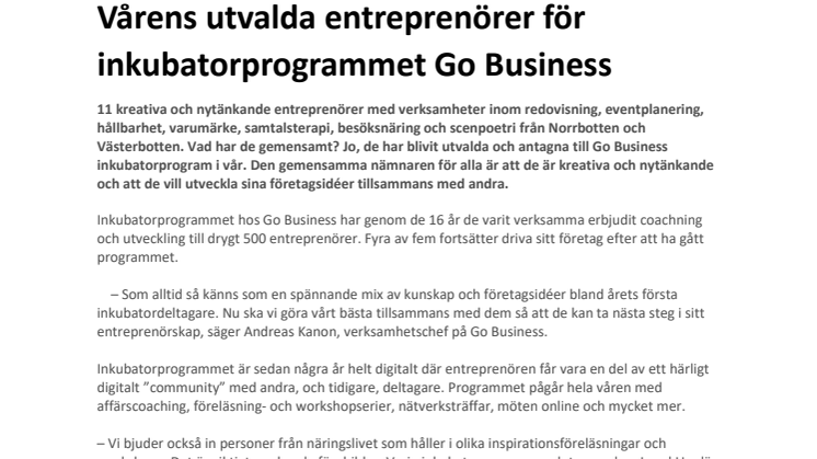 Lista över vårens deltagare i Go Business inkubatorprogram: