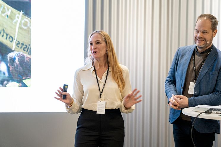T.v. Kommunikationschef Karin Hellgren och t.h. hållbarhetschef Carl-Johan Sigfridsson, OBOS, talade under Plannjas event om fossilfritt.