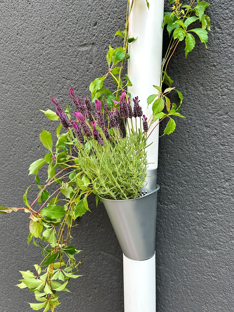Plannja har tagit fram en prototyp på en delvis självbevattnande kruka för stuprör i plåt, ett så kallat odlingssvep.