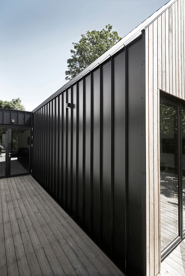 Förslag på tak och fasad med profilen Plannja Trend i matt svart (PL01). Nu finns produkten inom ramen för nya varumärket Plannja Infinity, där profilerna har tillverkats av återvunnet stål.