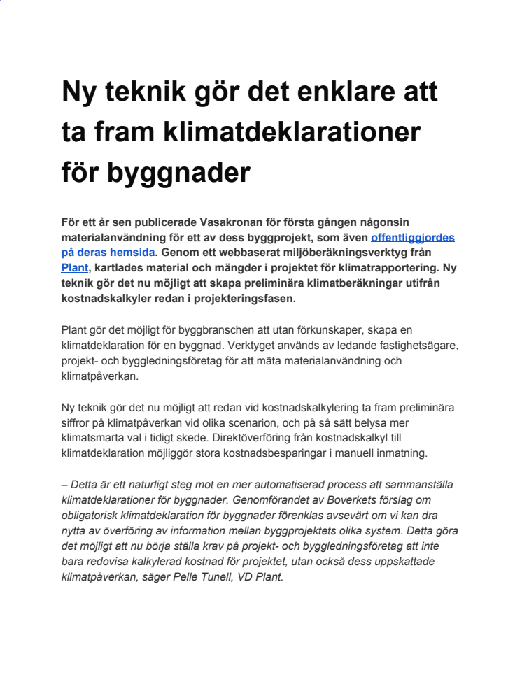 Ny teknik gör det nu möjligt att redan vid kostnadskalkylering ta fram preliminära siffror på klimatpåverkan vid olika scenarion, och på så sätt belysa mer klimatsmarta val i tidigt skede. Direktöverföring från kostnadskalkyl till klimatdeklaration möjliggör stora kostnadsbesparingar i manuell inmatning.
