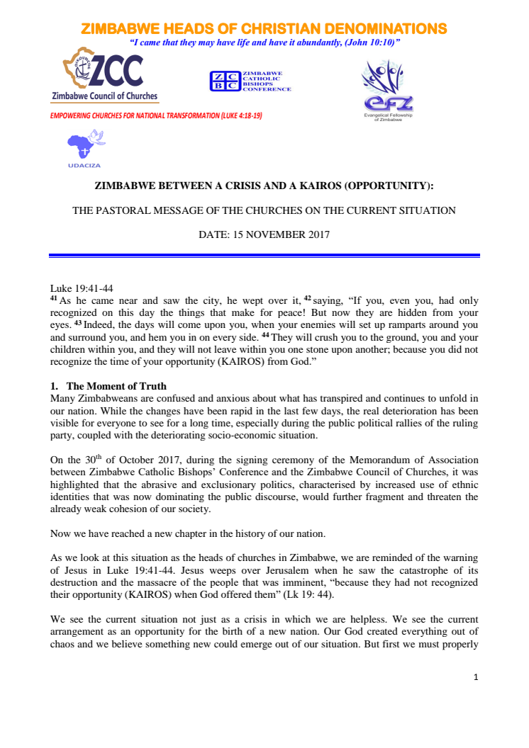 Evangeliska alliansen, katolska biskopskonferensen och Zimbabwes kyrkoråd, Zimbabwe Council of Churches, har antagit ett uttalande i samband med den politiska kris som landet just nu går igenom.