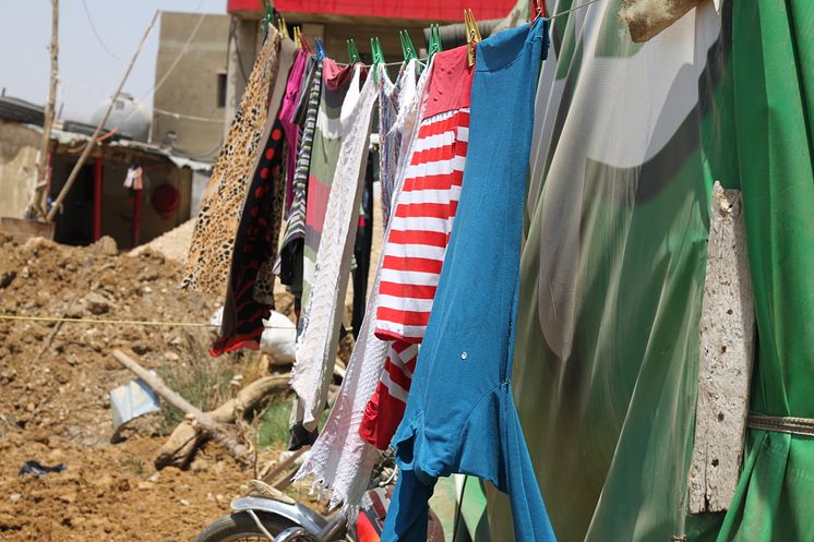 Utanför Dianas hem i Bekaadalen i Libanon hänger kläderna på tork i solen. Foto: Jonathan Ulenius