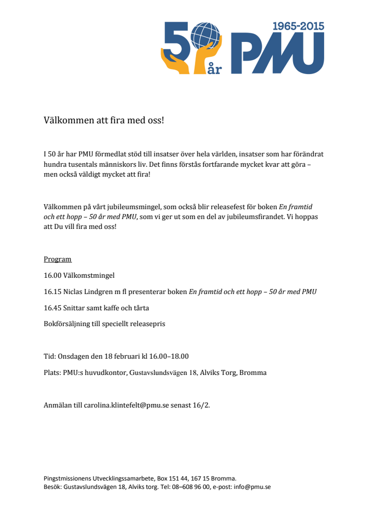 I 50 år har PMU förmedlat stöd till insatser över hela världen, insatser som har förändrat hundra tusentals människors liv. Den 18 februari släpps jubileumsboken En framtid och ett hopp i samband med PMU:s jubileumsmingel.