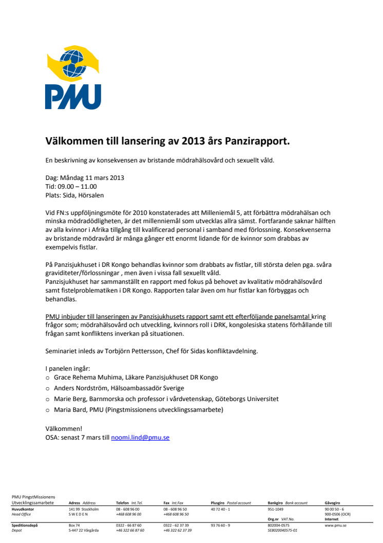 Den 11 mars inbjuder PMU (Pingstmissionens utvecklingssamarbete) till lanseringen av Panzisjukhusets rapport, som belyser problemet med fistlar i DR Kongo.