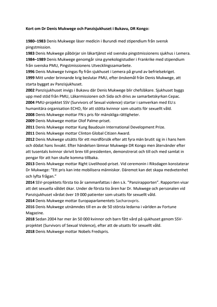 Tack vare stöd från Sverige kunde Denis Mukwege utbilda sig till läkare och sedan 2002 är han chefsläkare vid Panzisjukhuset i östra DR Kongo. Sedan 2004 har mer än 50 000 kvinnor och barn fått vård på sjukhuset genom SSV-projektet (Survivors of Sexual Violence), efter att de utsatts för sexuellt våld. Sjukhuset har utvecklat en hög kompetens inom avancerad gynekologisk kirurgi.