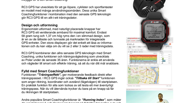 Polar som är pionjär och marknadsledande inom pulsmätning lanserar nu RC3 GPS, nya generationens träningsdator med inbyggd GPS och Smart Coaching.