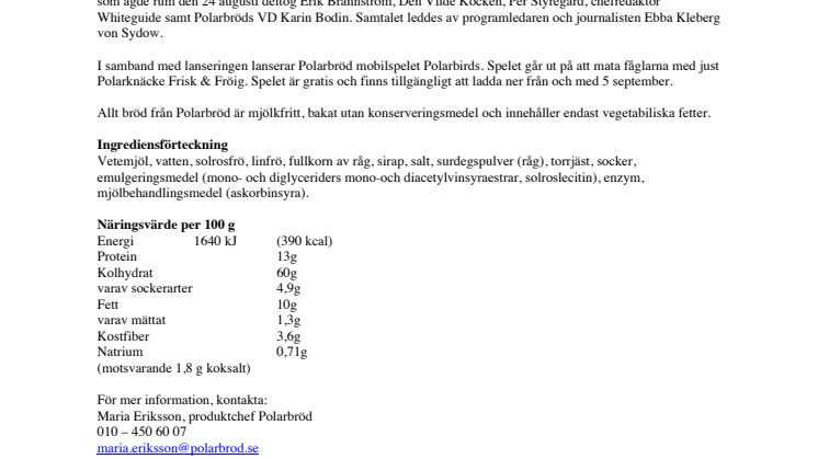 Bröd engagerar. I samband med lanseringen bjöd Polarbröd in till ett samtal om brödets utveckling och framtid. Bröd är en fråga som har blivit en viktig livsstilsfråga och är viktig för Sveriges livsmedelsindustri. I samtalet som ägde rum den 24 augusti deltog Erik Brännström, Den Vilde Kocken, Per Styregård, chefredaktör Whiteguide samt Polarbröds VD Karin Bodin. Samtalet leddes av programledaren och journalisten Ebba Kleberg von Sydow.
