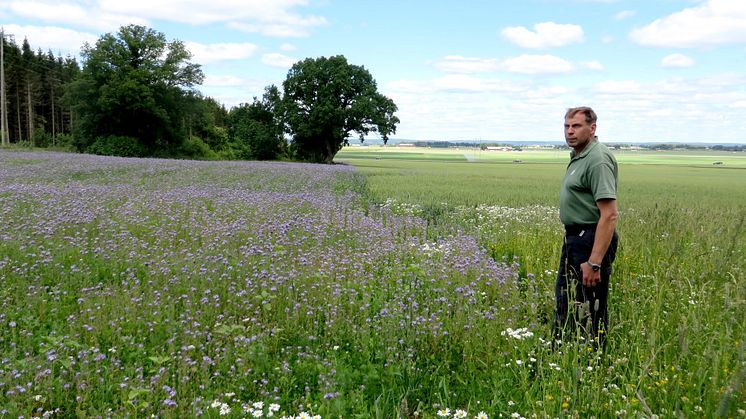 Niclas Malm på Glyttinge Gård visar en blommande kantzon vid sina odlingar. Foto: Jenny Henriksson.