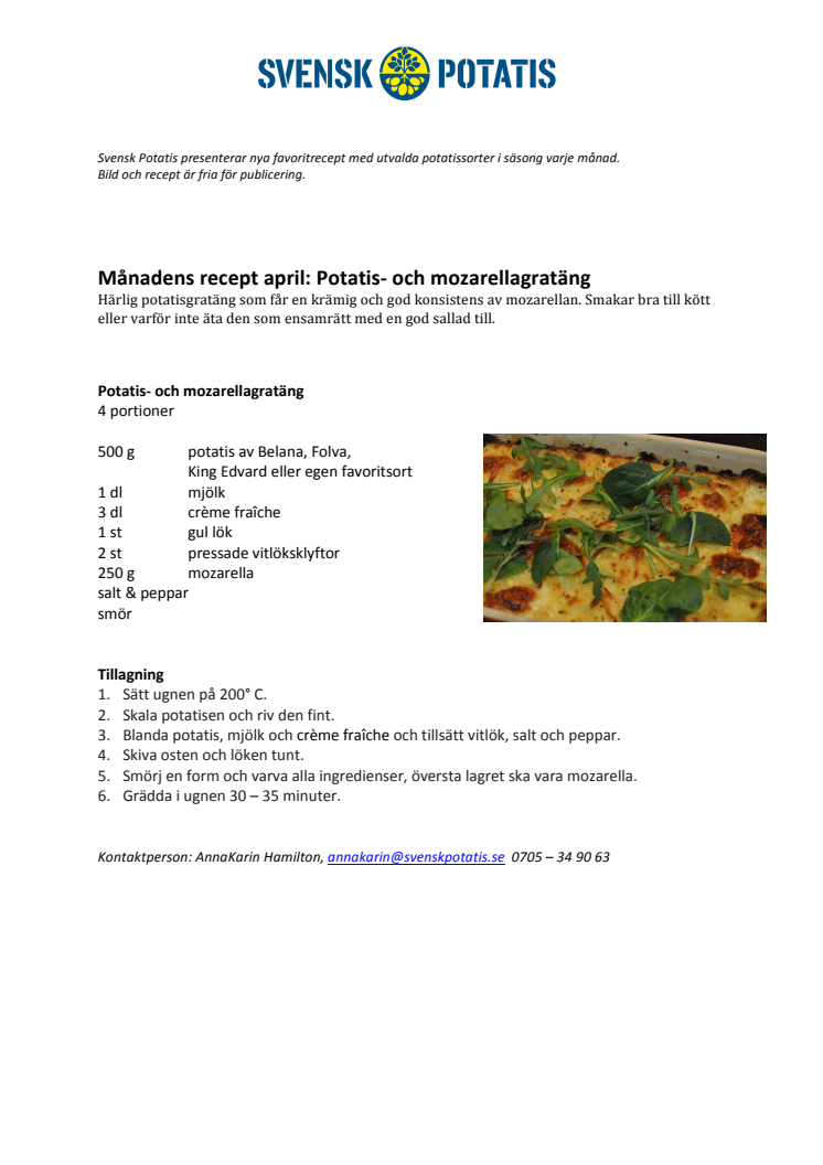 Härlig potatisgratäng som får en krämig och god konsistens av mozarellan. Passar bra till påskbuffén eller varför inte äta den som ensamrätt med en god sallad till.