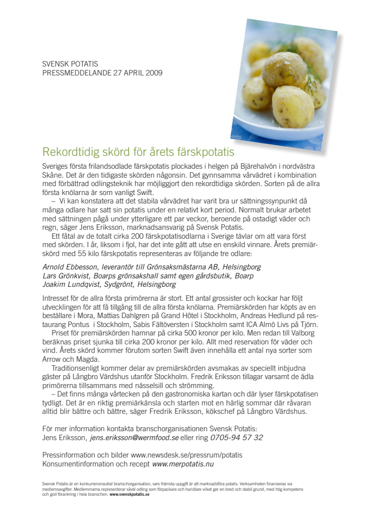 Sveriges första frilandsodlade färskpotatis plockades i helgen på Bjärehalvön i nordvästra Skåne. Det är den tidigaste skörden någonsin. Det gynnsamma vårvädret i kombination med förbättrad odlingsteknik har möjliggjort den rekordtidiga skörden. Sorten på de allra första knölarna är som vanligt Swift.