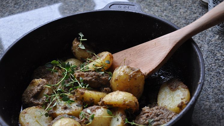 - 5. Häll på vinet och låt det ånga in i potatisen, salta och peppra.