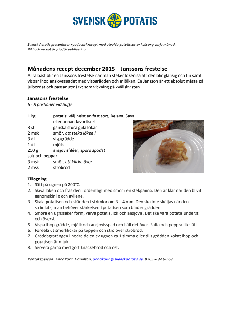 Kontaktperson: AnnaKarin Hamilton, annakarin@svenskpotatis.se 0705 – 34 90 63