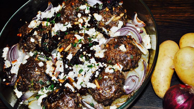 - Ta ut formen med potatis ur ugnen och lägg på biffarna och rödlöken. Sätt in formen i ugnen och låt den stå i ca 30 minuter.