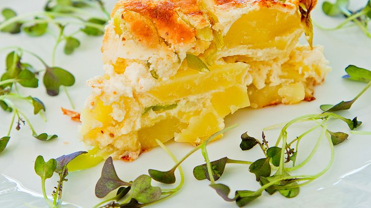 Vinnande bidrag till Årets studentkock – tema potatis. En av 90-talets mest populära rätter, en krämig, smakrik och god kaka. Juryns motivering är att i kombination med en ljuvligt god smak är den även enkel och billig att tillaga. Utmärkt rätt att servera på buffén, till grillat eller till fisken. God även dagen efter. Alla sorters potatis går att använda, nu på sommaren går det utmärkt med färskpotatisen.