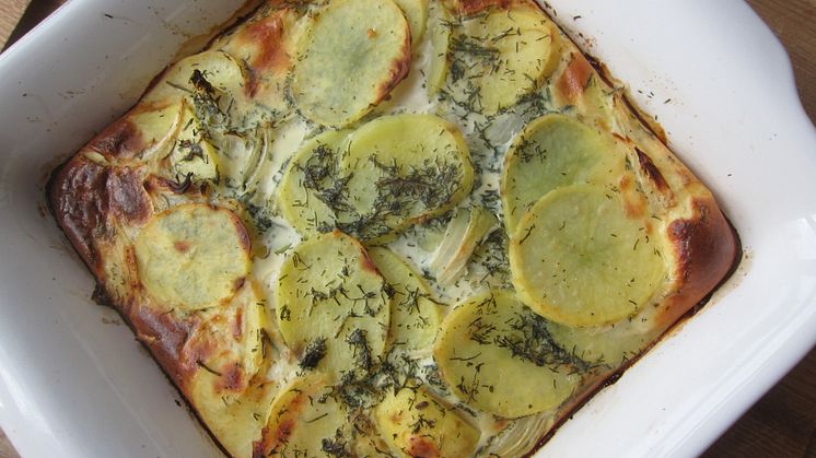 - 6.Grädda i mitten av ugnen ca 40 - 45 minuter tills potatisen är mjuk och lådan har fått en fin färg.