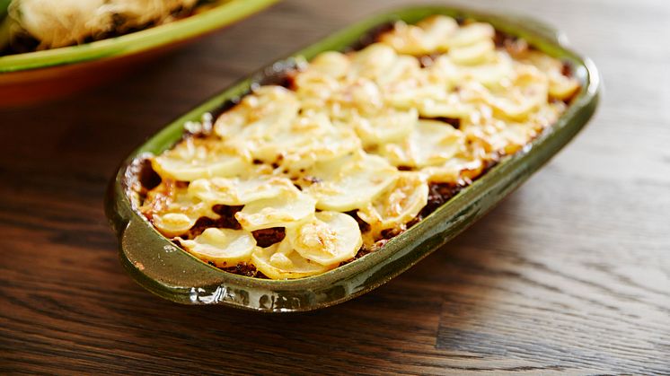 5 Smöra en ugnsfast form och varva potatis och köttfärsen.