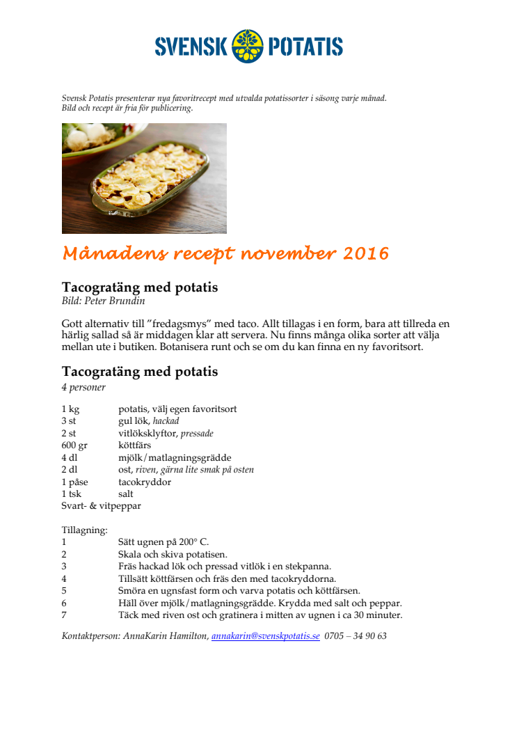 Kontaktperson: AnnaKarin Hamilton, annakarin@svenskpotatis.se 0705 – 34 90 63