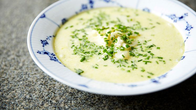 4 Låt soppan koka upp på nytt, vispa ner grädden och tillsätt osten samt gräslöken.