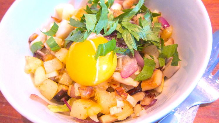 2. Rensa och dela svampen i bitar. Stek i 1 msk olja ca 10 minuter, blanda ner svampen med potatisen.