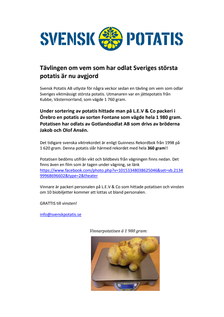 Under sortering av potatis hittade man på L.E.V & Co packeri i Örebro en potatis av sorten Fontane som vägde hela 1 980 gram. Potatisen har odlats av Gotlandsodlat AB som drivs av bröderna Jakob och Olof Ansén.