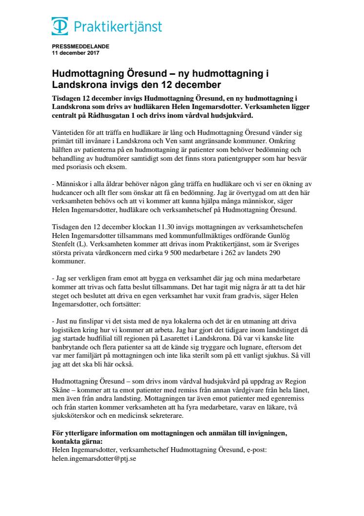 Tisdagen 12 december invigs Hudmottagning Öresund, en ny hudmottagning i Landskrona som drivs av hudläkaren Helen Ingemarsdotter. Verksamheten ligger centralt på Rådhusgatan 1 och drivs inom vårdval hudsjukvård.