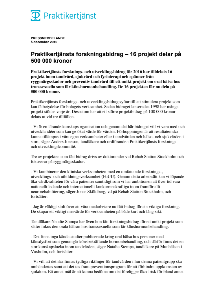 Praktikertjänsts forsknings- och utvecklingsbidrag för 2016 har tilldelats 16 projekt inom tandvård, sjukvård och fysioterapi och spänner från ryggmärgsskador och preventiv tandvård till ett unikt projekt om oral hälsa hos transsexuella som får könshormonbehandling. De 16 projekten får nu dela på 500 000 kronor.