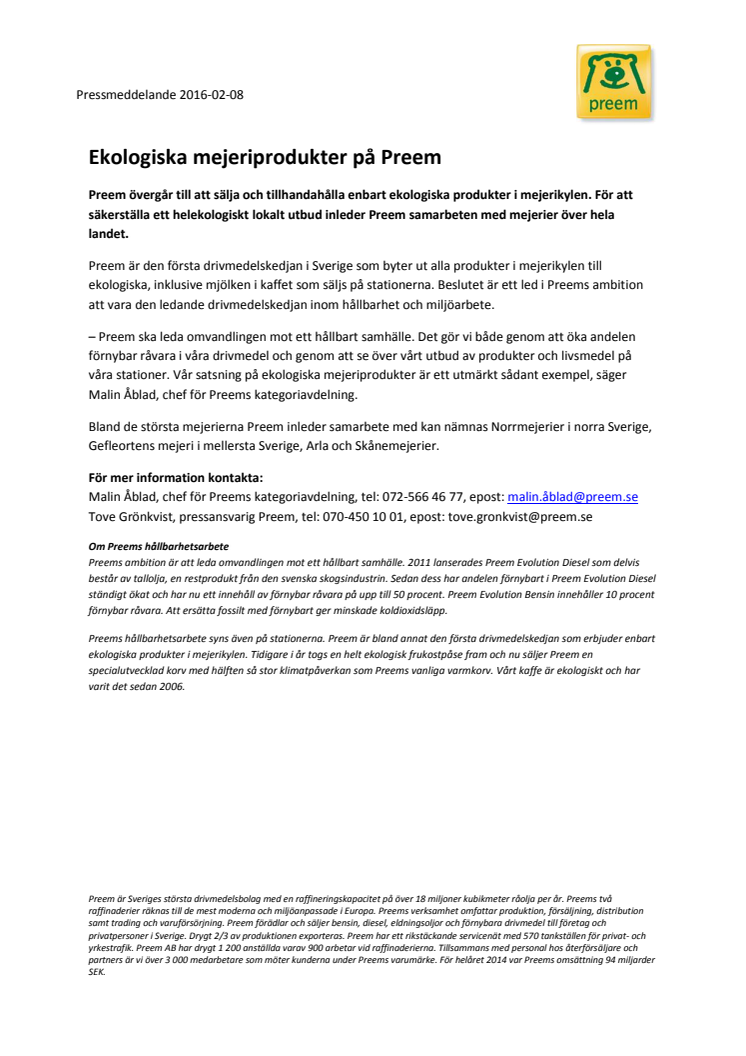 Preem övergår till att sälja och tillhandahålla enbart ekologiska produkter i mejerikylen. För att säkerställa ett helekologiskt lokalt utbud inleder Preem samarbeten med mejerier över hela landet.