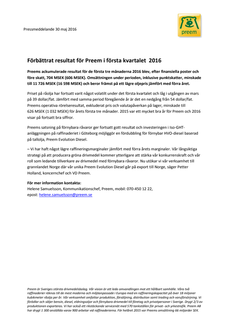 Preems ackumulerade resultat för de första tre månaderna 2016 blev, efter finansiella poster och före skatt, 704 MSEK (606 MSEK). Omsättningen under perioden, inklusive punktskatter, minskade till 11 726 MSEK (16 598 MSEK) och beror främst på ett lägre oljepris jämfört med förra året. Preems satsning på förnybara råvaror ger fortsatt gott resultat.