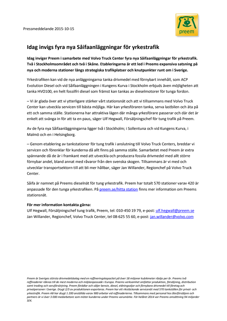 Idag inviger Preem i samarbete med Volvo Truck Center fyra nya Såifaanläggningar för yrkestrafik. Två i Stockholmsområdet och två i Skåne. Vid Såifaanläggningen i Kungens Kurva i Stockholm erbjuds även möjligheten att tanka HVO100, en helt fossilfri diesel som främst kan tankas av dieselmotorer för tunga fordon.