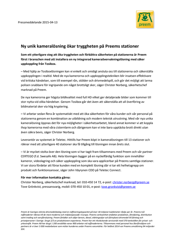 Preem är först i branschen med att installera en ny integrerad kameraövervakningslösning med säker uppkoppling från Tosibox. Med hjälp av Tosiboxlösningen går det enkelt och smidigt att ansluta till stationerna och säkerställa uppkopplingen i realtid. Med de nya kamerorna och uppkopplingstekniken blir insatsen effektivare vid kritiska händelser, som till exempel rån, stölder och drivmedelspill.