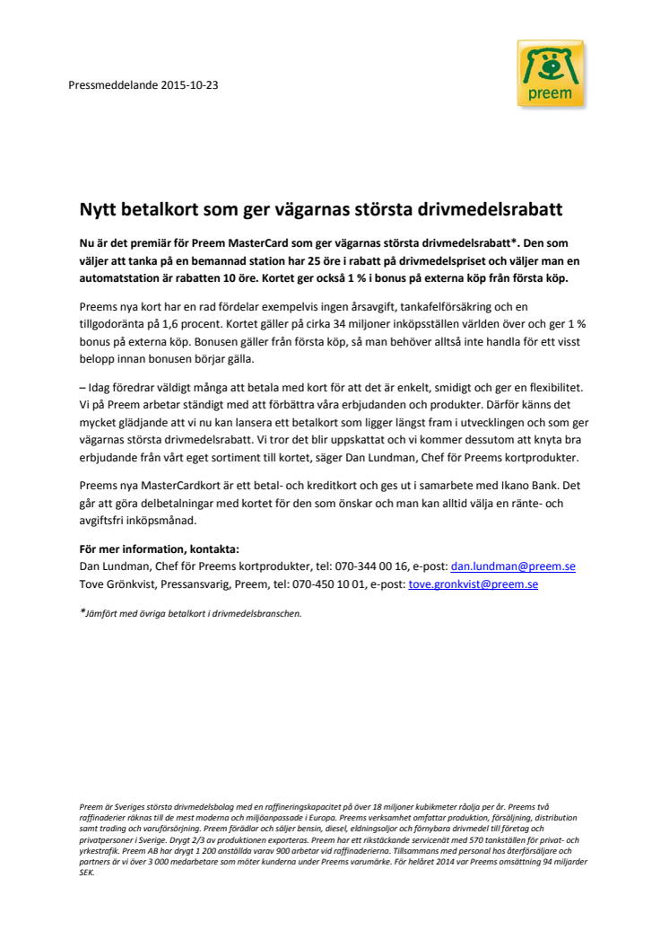 Nu är det premiär för Preem MasterCard som ger vägarnas största drivmedelsrabatt*. Den som väljer att tanka på en bemannad station har 25 öre i rabatt på drivmedelspriset och väljer man en automatstation är rabatten 10 öre. Kortet ger också 1 % i bonus på externa köp från första köp.