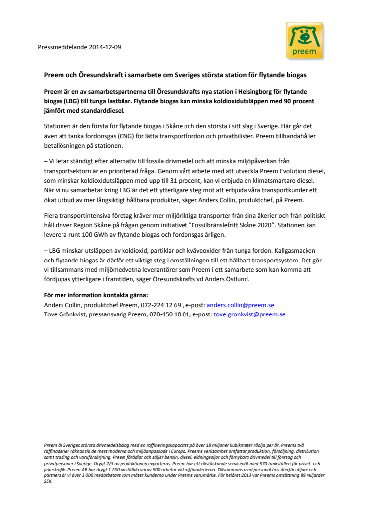Preem är en av samarbetspartnerna till Öresundskrafts nya station i Helsingborg för flytande biogas (LBG) till tunga lastbilar. Stationen är den första för flytande biogas i Skåne och den största i sitt slag i Sverige. Här går det även att tanka fordonsgas (CNG) för lätta transportfordon och privatbilister. Preem tillhandahåller betallösningen på stationen.