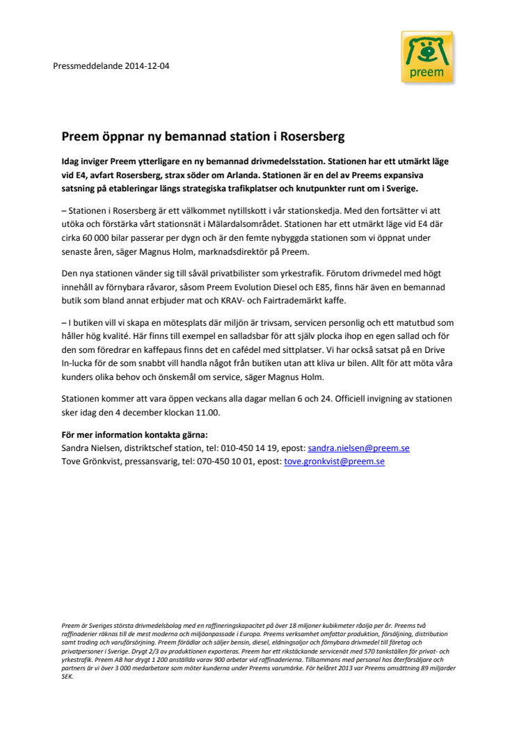 Den 4 december klockan 11.00 inviger Preem ytterligare en ny bemannad drivmedelsstation. Stationen har ett utmärkt läge vid E4, avfart Rosersberg, strax söder om Arlanda.