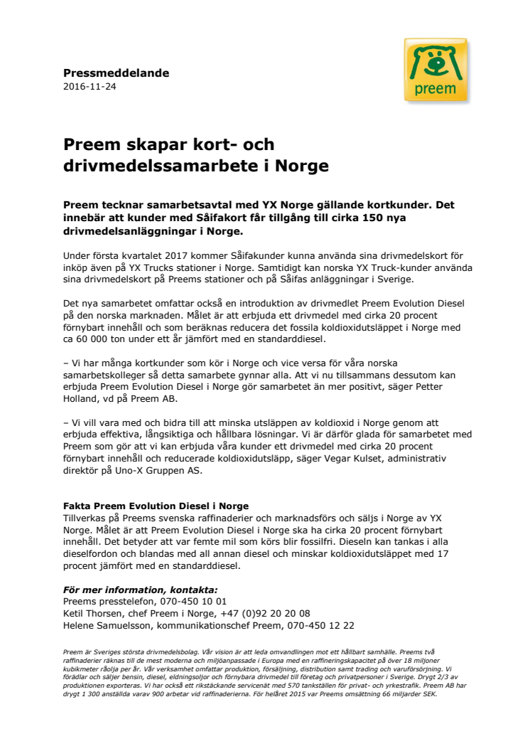 Preem tecknar samarbetsavtal med YX Norge gällande kortkunder. Det innebär att kunder med Såifakort får tillgång till cirka 150 nya drivmedelsanläggningar i Norge.