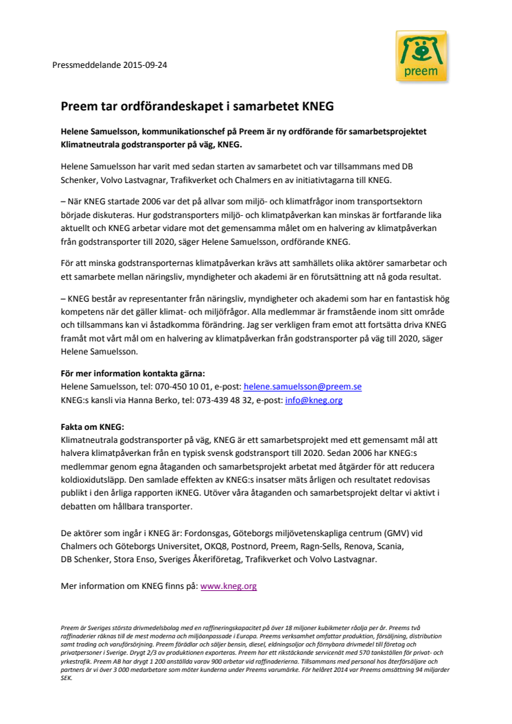 Helene Samuelsson, kommunikationschef på Preem är ny ordförande för samarbetsprojektet Klimatneutrala godstransporter på väg, KNEG. KNEG arbetar vidare mot det gemensamma målet om en halvering av klimatpåverkan från godstransporter till 2020