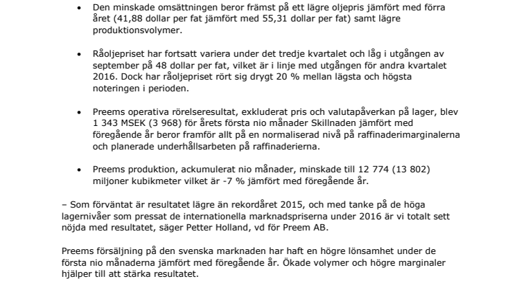 – Som förväntat är resultatet lägre än rekordåret 2015, och med tanke på de höga lagernivåer som pressat de internationella marknadspriserna under 2016 är vi totalt sett nöjda med resultatet, säger Petter Holland, vd för Preem AB.