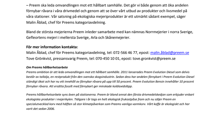 Preem är den första drivmedelskedjan i Sverige som byter ut alla produkter i mejerikylen till ekologiska, inklusive mjölken i kaffet som säljs på stationerna. Beslutet är ett led i Preems ambition att vara den ledande drivmedelskedjan inom hållbarhet och miljöarbete.