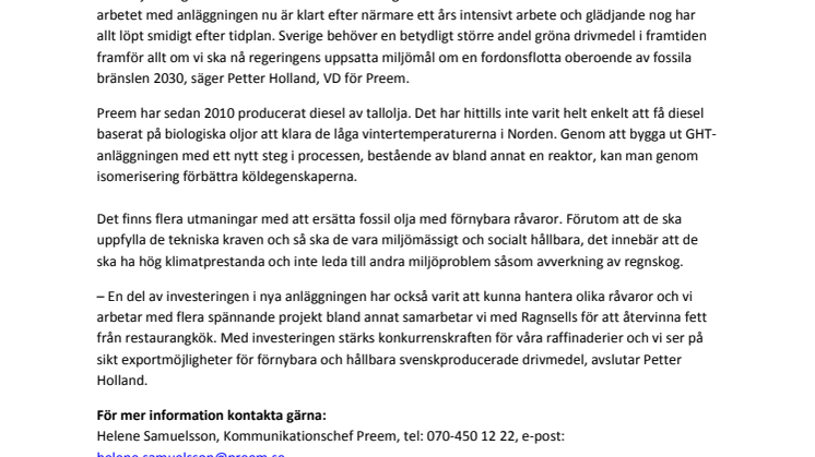 – Vi väljer att gå i framkant för att leda utvecklingen mot ett hållbart samhälle. Det känns bra att arbetet med anläggningen nu är klart efter närmare ett års intensivt arbete och glädjande nog har allt löpt smidigt efter tidplan. Sverige behöver en betydligt större andel gröna drivmedel i framtiden framför allt om vi ska nå regeringens uppsatta miljömål om en fordonsflotta oberoende av fossila bränslen 2030, säger Petter Holland, VD för Preem.