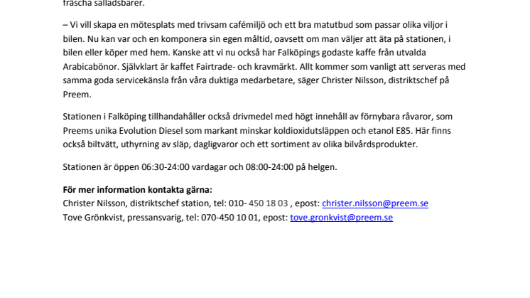 – Vi vill skapa en mötesplats med trivsam cafémiljö och ett bra matutbud som passar olika viljor i bilen. Nu kan var och en komponera sin egen måltid, oavsett om man väljer att äta på stationen, i bilen eller köper med hem. Kanske att vi nu också har Falköpings godaste kaffe från utvalda Arabicabönor. Självklart är kaffet Fairtrade- och kravmärkt. Allt kommer som vanligt att serveras med samma goda servicekänsla från våra duktiga medarbetare, säger Christer Nilsson, distriktschef på Preem.