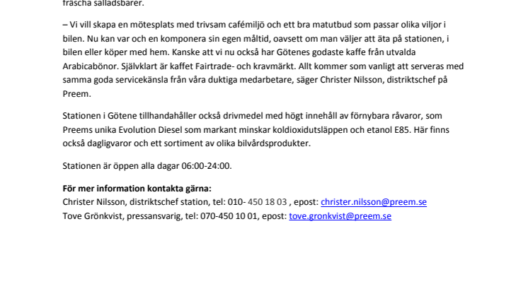 – Vi vill skapa en mötesplats med trivsam cafémiljö och ett bra matutbud som passar olika viljor i bilen. Nu kan var och en komponera sin egen måltid, oavsett om man väljer att äta på stationen, i bilen eller köper med hem. Kanske att vi nu också har Götenes godaste kaffe från utvalda Arabicabönor. Självklart är kaffet Fairtrade- och kravmärkt. Allt kommer som vanligt att serveras med samma goda servicekänsla från våra duktiga medarbetare, säger Christer Nilsson, distriktschef på Preem.