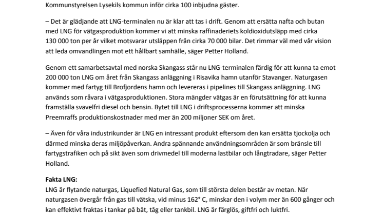 Nu är nya LNG-terminalen vid Preems raffinaderi i Lysekil invigd. Anläggningen kommer att minska koldioxidutsläppen vid raffinaderiet med ca 130 000 ton per år och har kostat