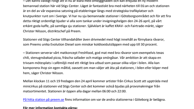 – Det känns väldigt roligt att vi nu är klara med ombyggnaden och kan erbjuda en ny modern bemannad station här vid Stigs Center. Läget är fantastiskt bra med närheten till E6:an och stationen är en del av vår expansiva satsning på etableringar längs med strategiska trafikplatser och knutpunkter runt om i Sverige. Vi har nu sju bemannade stationer i Göteborgsområdet och för att fira detta riktigt ordentligt bjuder vi alla som tankar under invigningshelgen den 24-26 april, på vårt erkänt goda kaffe, på samtliga sju stationer. Självklart är kaffet KRAV- och Fairtrade-märkt, säger Christer Nilsson, distriktschef på Preem.