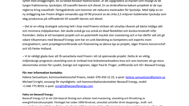 Preem och det amerikanska bolaget Beowulf Energy LLC (US) har tecknat ett samarbetsavtal för att undersöka möjligheterna att bygga en ny anläggning i Lysekil som bättre möter omvärldens krav på miljöanpassade bränslen.