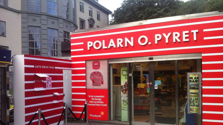 För att fira att Polarn O. Pyrets hela sortiment nu finns tillgängligt på Pressbyrån, i form av presentkort, har vi byggt om en Pressbyråbutik till en Polarn O. Pyretbutik. Men vi har även byggt världens första och enda latte-drive-thru för barnvagnar!