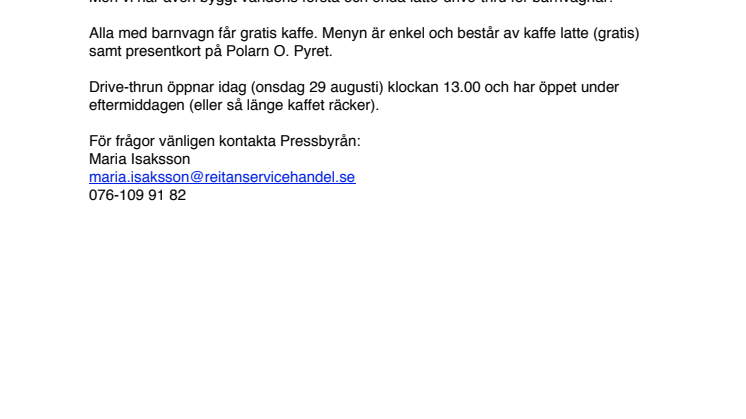 Drive-thrun öppnar idag (onsdag 29 augusti) klockan 13.00 och har öppet under eftermiddagen (eller så länge kaffet räcker).