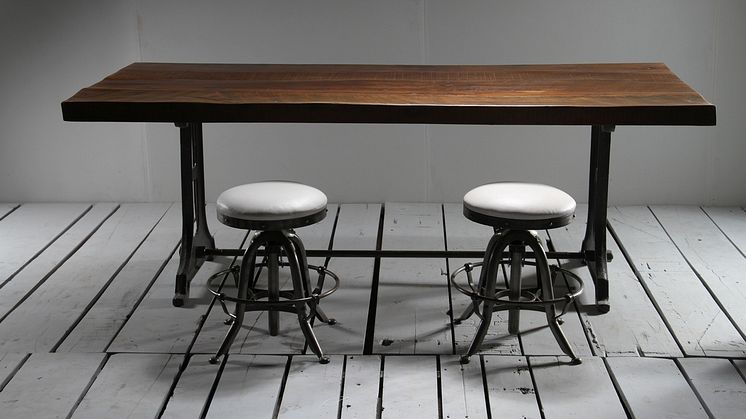 På bilden syns ett gediget och mycket vackert matbord från My Home My Way med bordsskiva av mörkbetsat återvunnet trä och underrede av återvunnet gjutjärn. Vill man ha extra gäster till middagen så finns det även sidobord med ihopfällbara ben som passar då man behöver lite mer plats. Bordet finns i olika längd och bredd med en höjd på 75 cm.